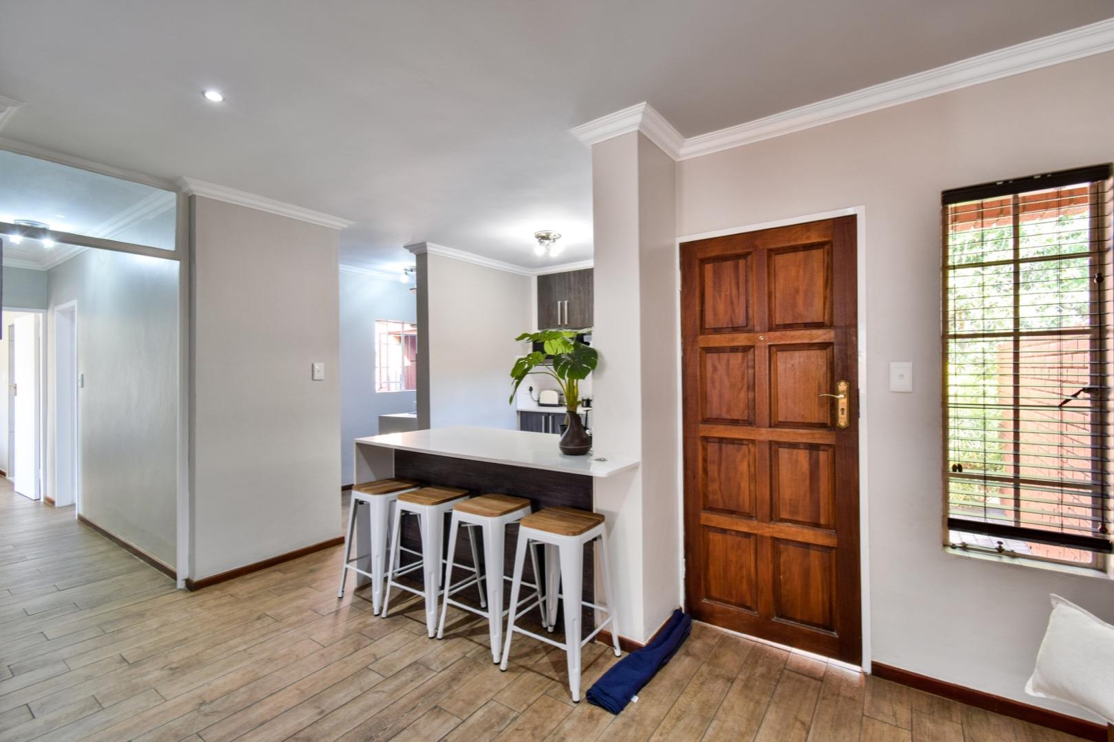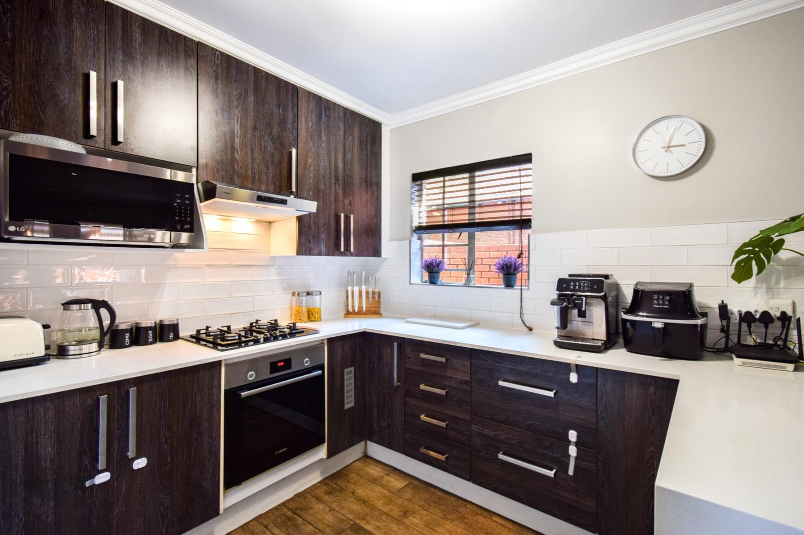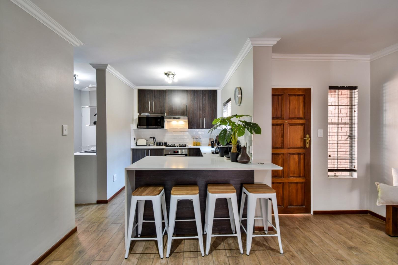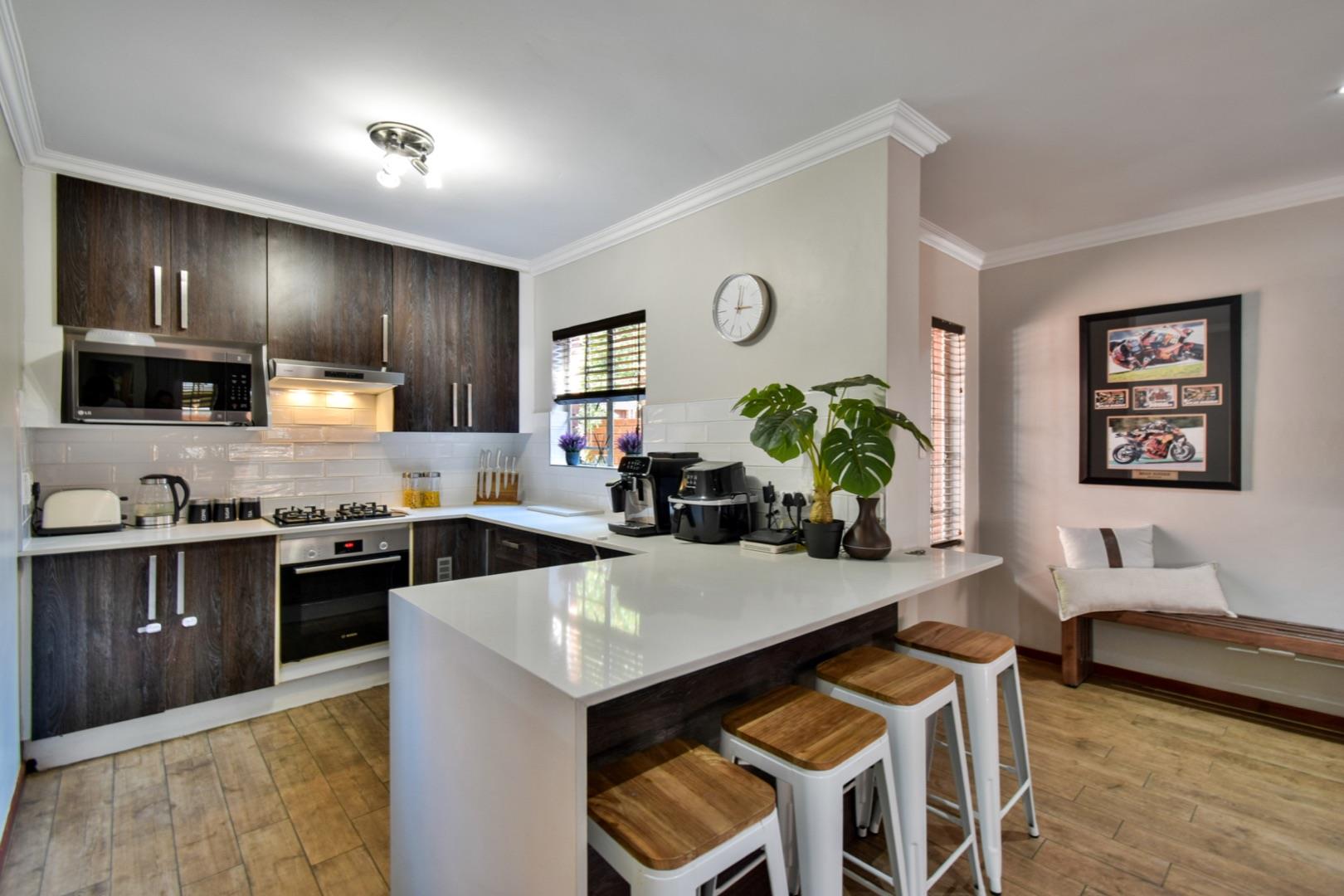 -Modern open-plan kitchen with caesar stone counters, double fridge space, gas hob and two appliance spaces in the separate scullery