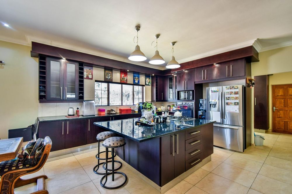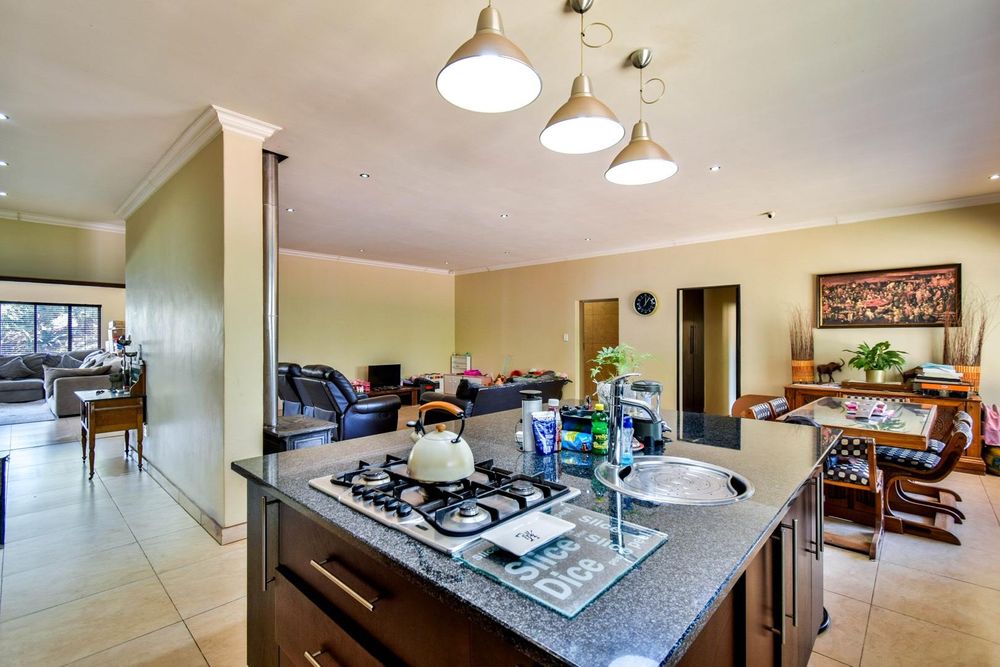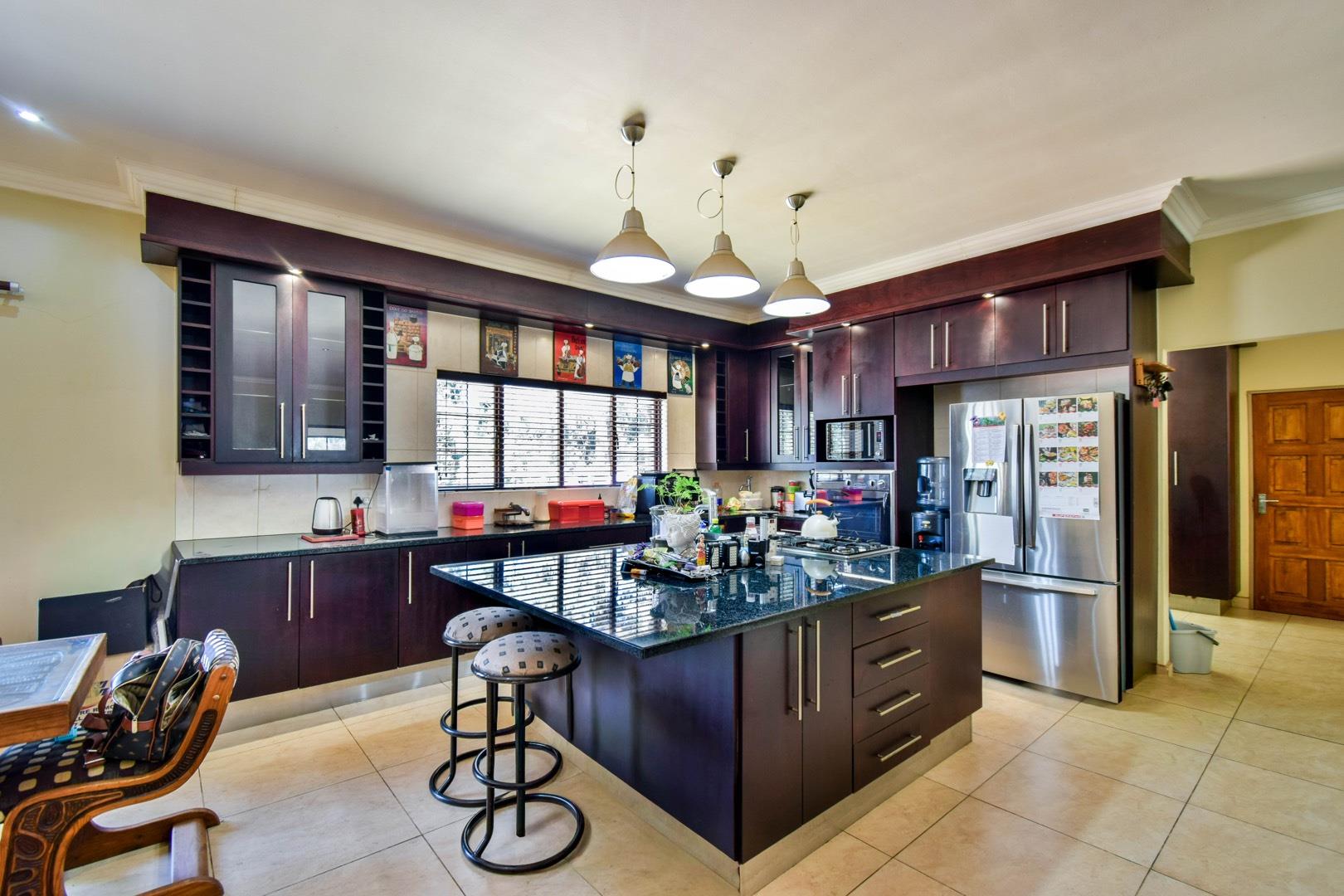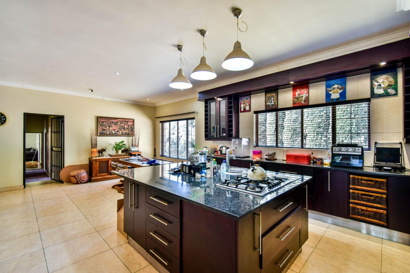 -Modern open-plan kitchen with centre island, gas hob, granite counter tops, double fridge space and separate scullery with walk-in pantry