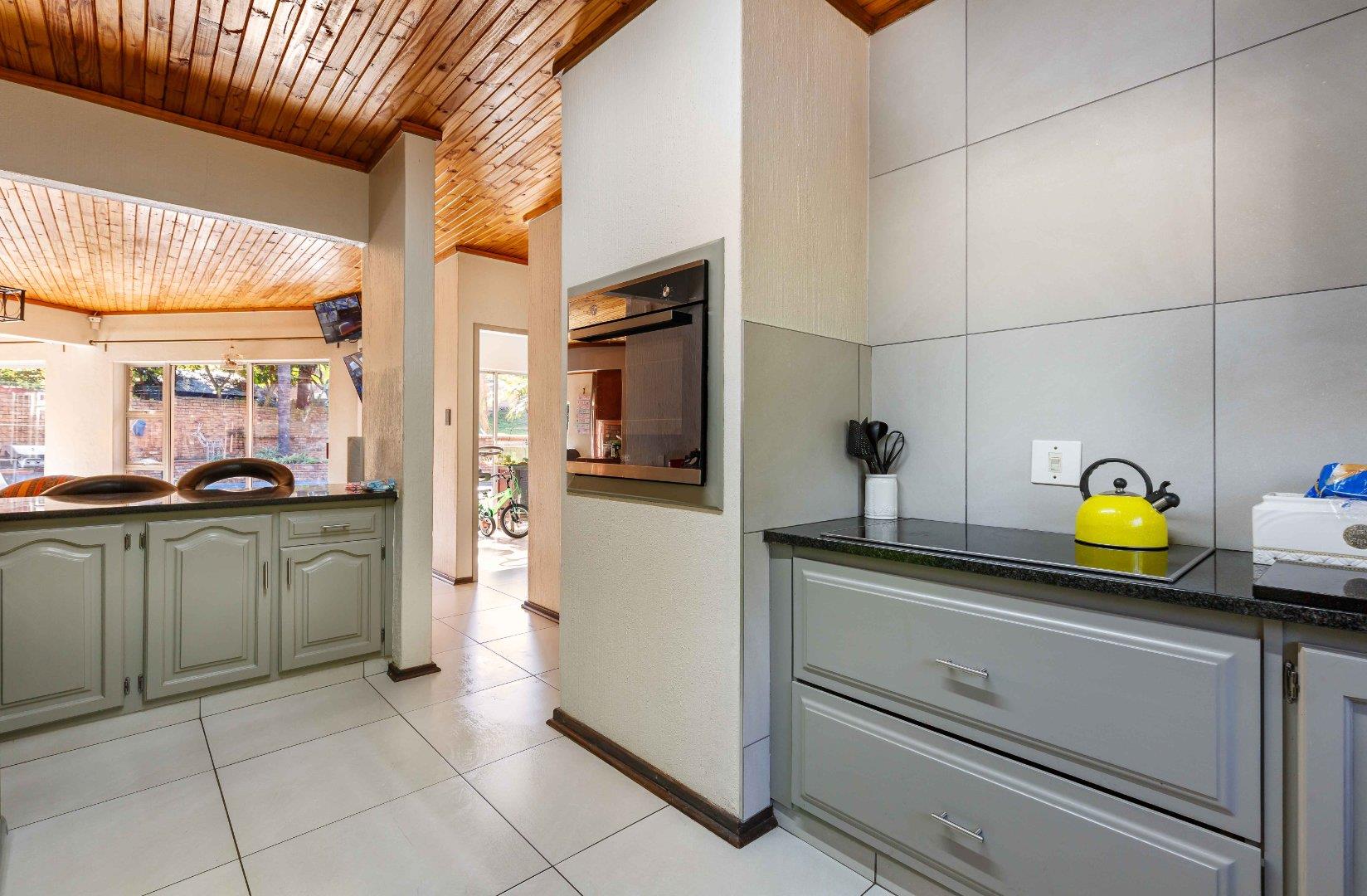 neatly redone kitchen with granite counter tops, a breakfast nook, double fridge space, a pantry and a separate scullery with space for three appliances