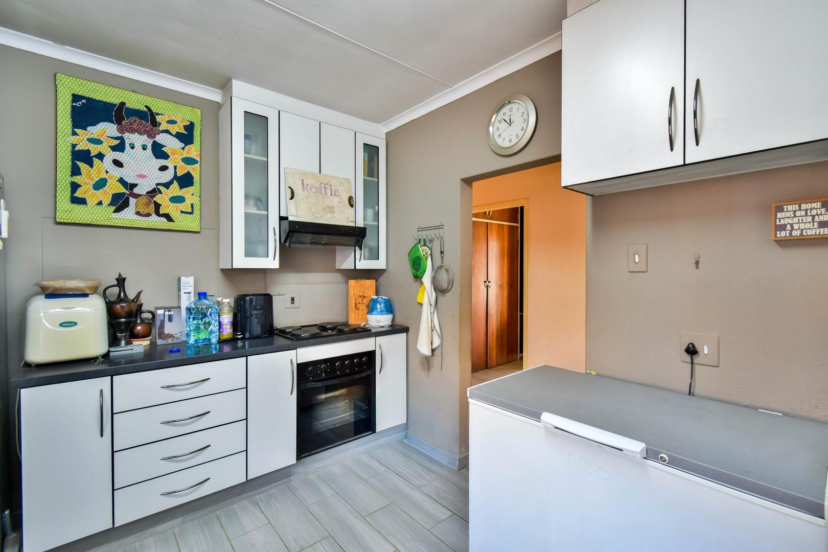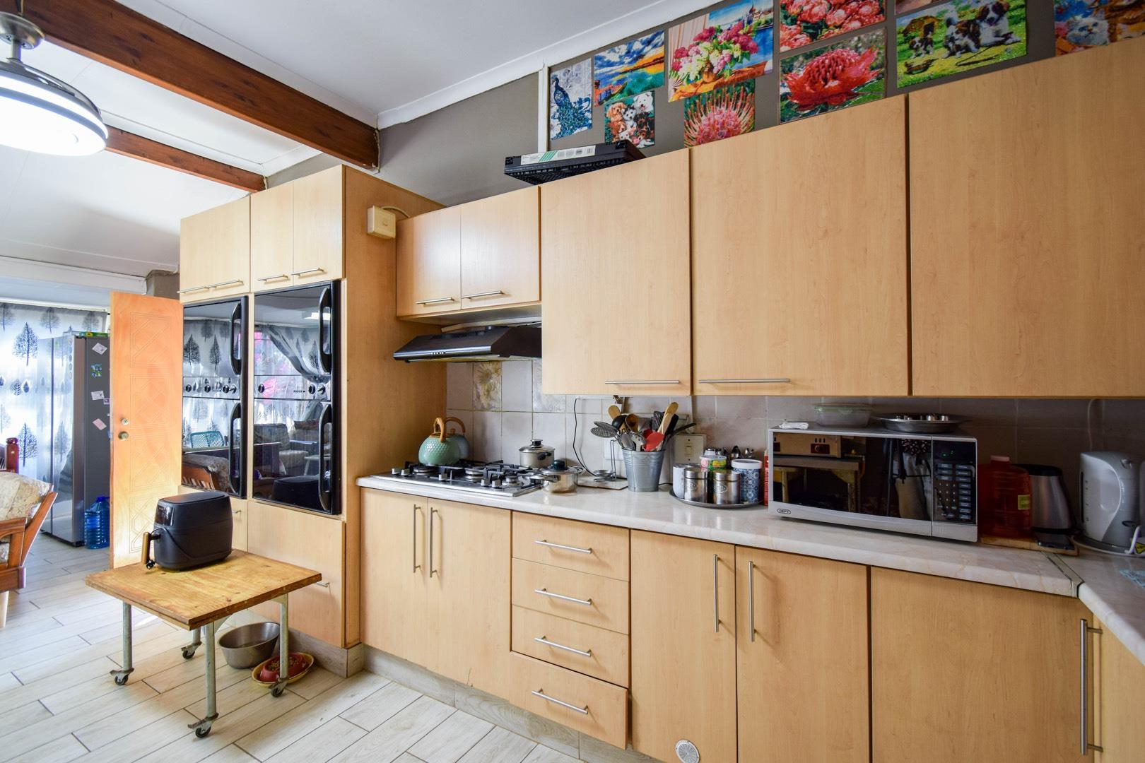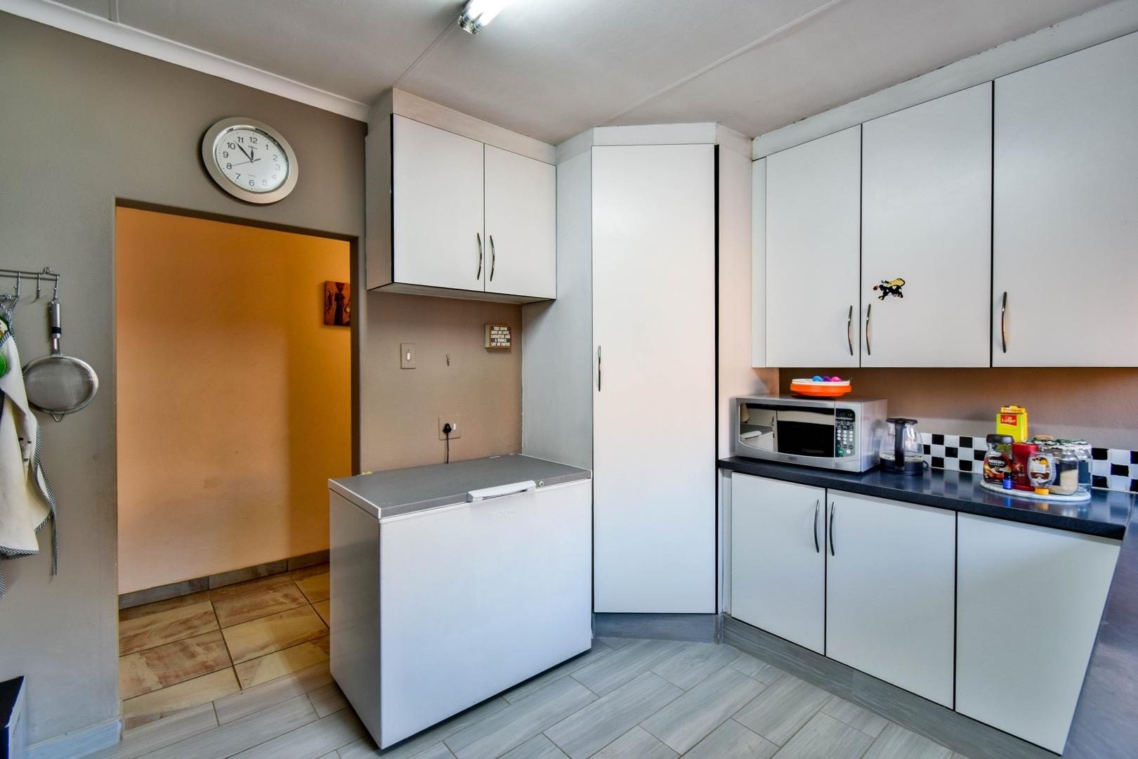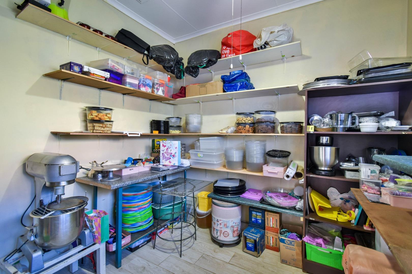 -Kitchen with built-in cupboards, pantry, single fridge space and chest freezer space
